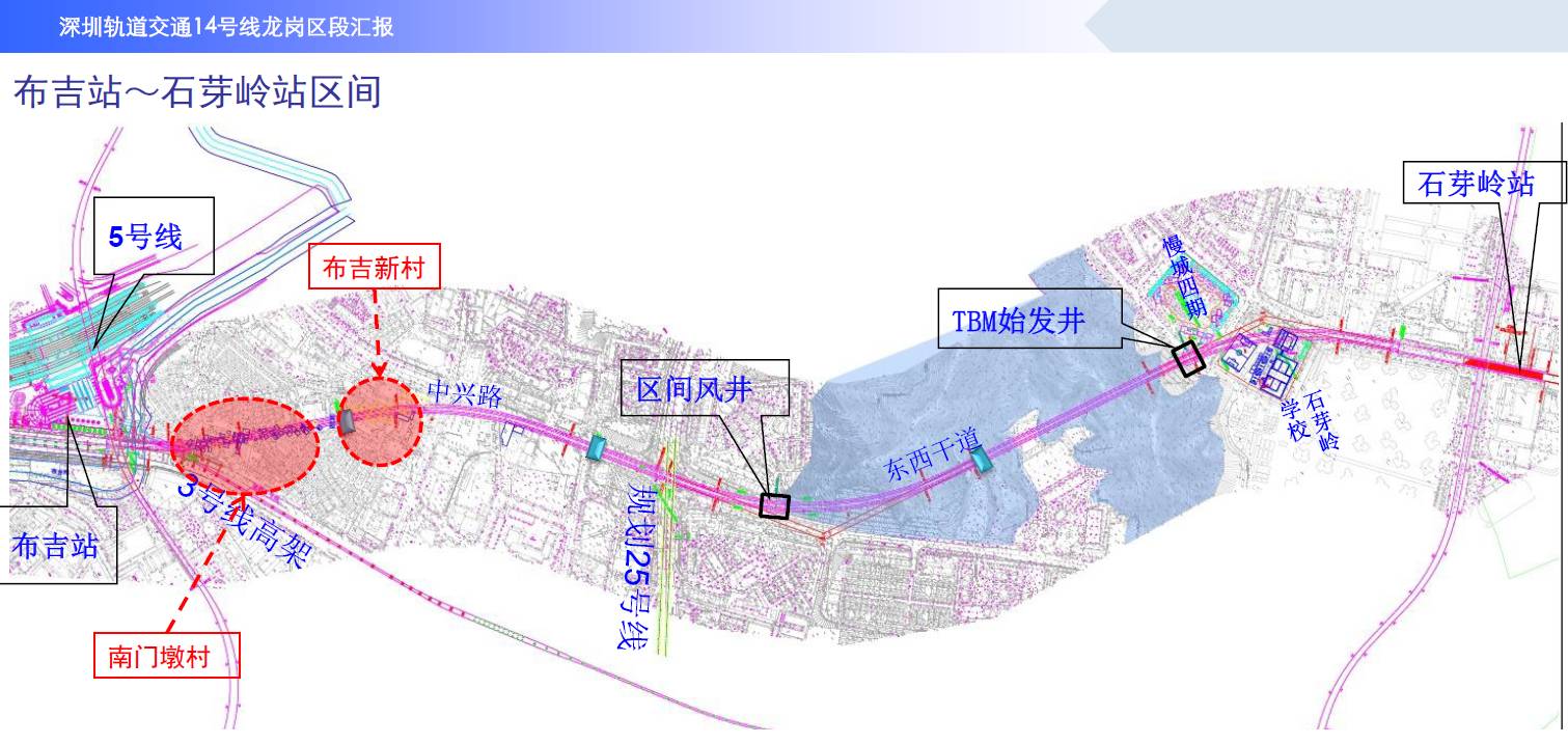 区间自布吉站出发后,沿龙岗大道地面辅道下方敷设,随后往东北方向拐入南门墩村及布吉新村地块内,穿越地块后往东北向拐入中兴路,沿中兴路-东西主干道下方敷设,其后从东西主干道往北拐入石芽岭信义体育公园下方,穿越公园地块后往东北方向拐入科技园路下方,随后沿科技园路-盛宝路下方敷设到达石芽岭站。布吉站至石芽岭站区间长度约3165.70米。 区间下穿南门墩村、布吉新村大面积民房,共涉及面积约19587平米 。
