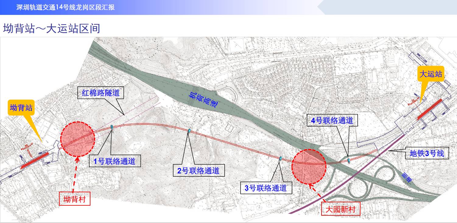 区间自坳背站出发后,沿红棉四路东北方向进入山体,下穿红棉路隧道,之后与机荷高速公路同向,下穿部分房屋,随后下穿机荷高速公路并往北拐入龙岗大道进入大运站。 区间长度约1907.929米,区间下穿坳背村、大园新村大面积民房,涉及面积约11225平米。
