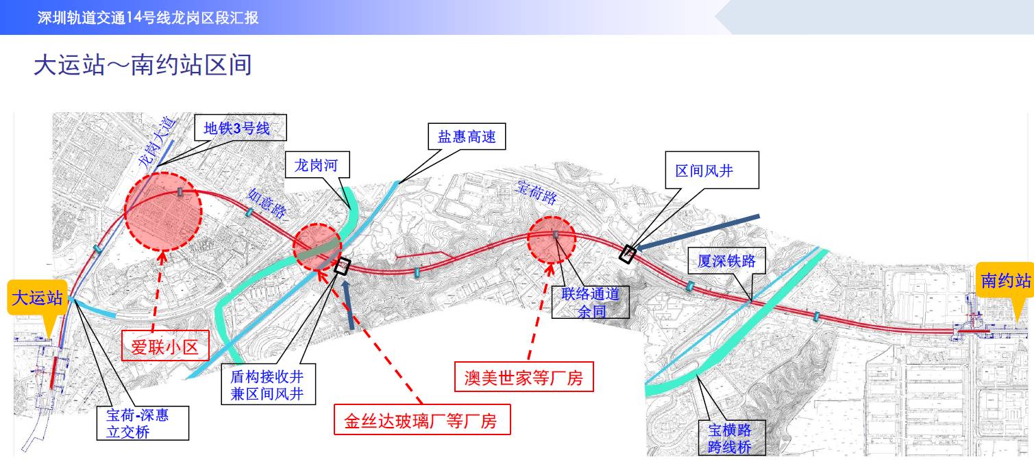 区间自大运站出发后,沿龙岗大道下方敷设,侧穿龙岗线高架桥桩及宝荷-深惠立交桥,下穿爱联小区后往东北向拐入如意路,其后下穿龙岗河、盐惠高速公路进入山体,出山体后下穿澳美世家家具厂等房屋群,最后沿宝荷路敷设,下穿厦深铁路、宝横路跨线桥到达南约站。大运站至南约站区间全长约5728.01米, 区间下穿爱联小区、金丝达玻璃厂、澳美世家等大面积民房及部分厂房,涉及面积约33027平米。