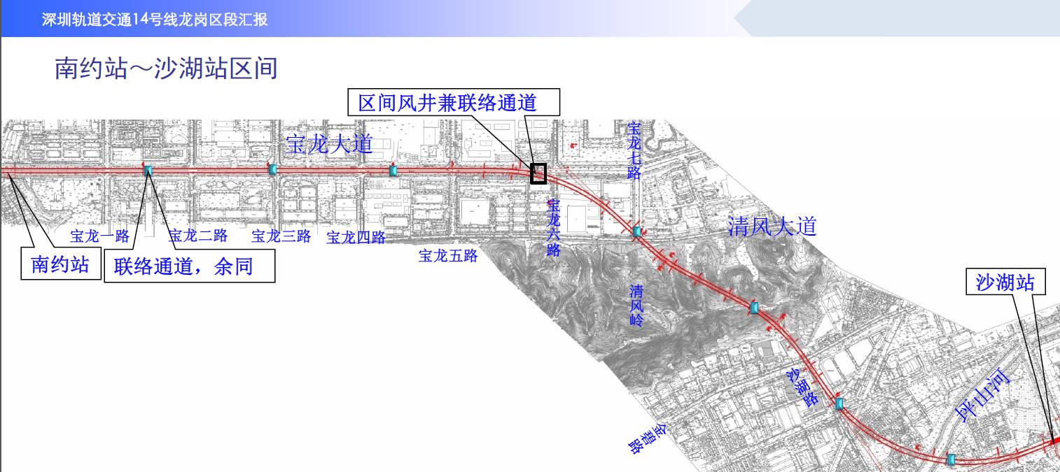 区间自南约站出发后,沿宝龙大道地面下方敷设,在宝龙大道与宝龙六路交汇处拐入东南方向,下穿清风大道、清风岭、金碧路后进入沙湖路,沿沙湖路地面下方敷设,穿越坪山河后向东拐入横坪路,最后沿横坪路地面下方敷设进入沙湖站。南约站至沙湖站区间全长5007.577米, 在龙岗区范围内不涉及拆迁。