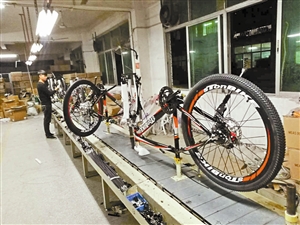 刘贵的自行车厂位于宝安区松岗街道的工业园,是一家中小型的传统自行车工厂,以生产折叠式自行车为主。搁在几年前,他想在忙碌中喘口气都难。如今一间2500米的工厂车间,仅有零星的几名个工人在流水线上组装着运动自行车。