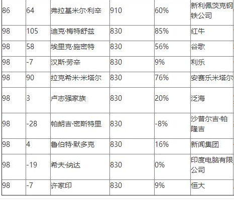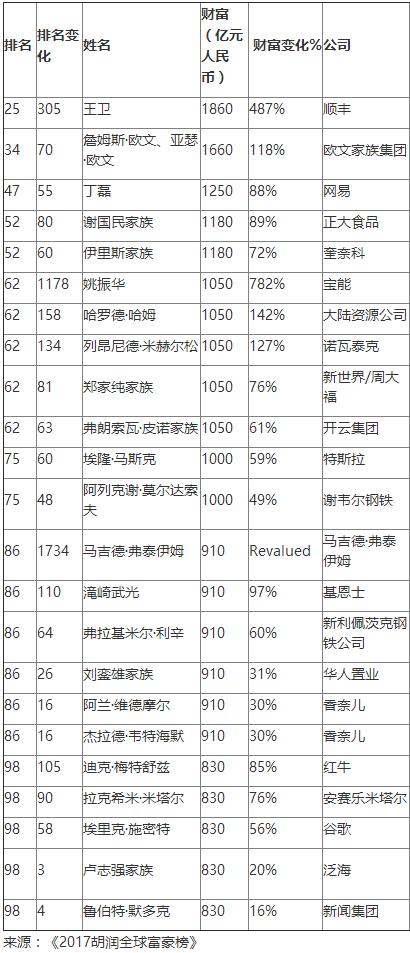 根据榜单,今年共计23位新人进入前100名,46岁的顺丰速递掌门人王卫表现最为亮眼。自顺丰速递2月上市以来,王卫的财富迅速飙升五倍,以1860亿元的财富位列大中华区第三,全球第25位,比去年上升305位。PayPal、Tesla和SpaceX三家公司的创始人埃隆·马斯克首次进入前100名。