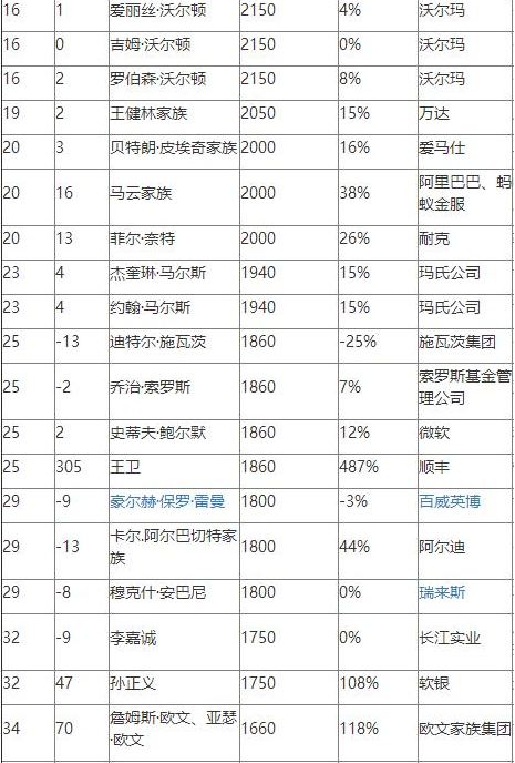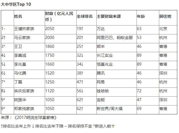在大中华地区,王健林及其家族以2050亿元财富蝉联首富,全球排名第19位,比去年上升2位。马云及其家族财富2000亿元位列大中华区第二,全球第20位,比去年上升16位。