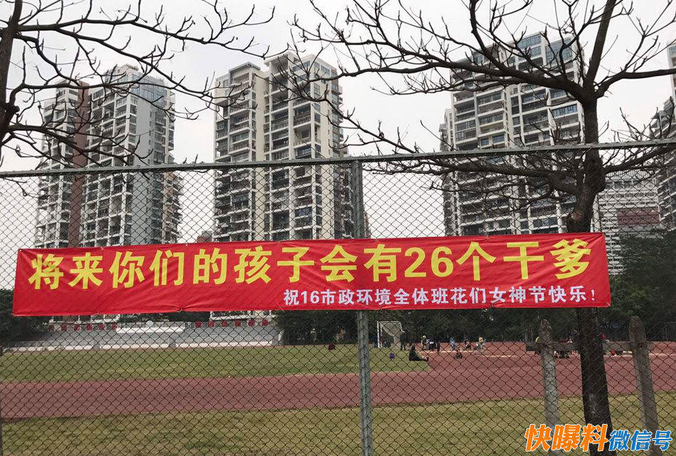 昨日(7日)上午,哈尔滨工业大学(深圳)校区学生涂同学向“快曝料”微信号报料,称昨日女生节校园里出现各种逗趣的标语,市政环境专业打出“将来你们的孩子会有26个干爹”,土木与环境工程学院献给土木六小花“管他男女几比几,我们心中只有你”,还有经济管理学院本科全体男生的“经管女孩,是爱,是暖,是希望”。