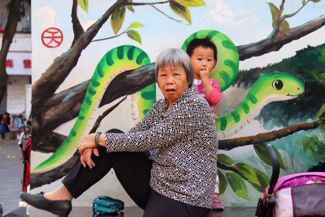 (在公园里休息的市民。小孩子的头仿佛被圈在青蛇涂鸦里。)