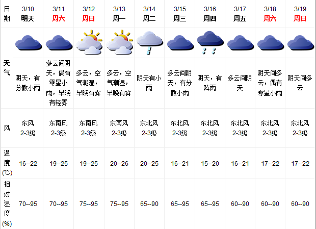 据深圳气象局最新发布,预计10-11日阴天,偶有分散阵雨,早晚能见度较低,气温回升;12-13日多云为主,可见阳光。14-16日受冷空气影响,阴天有小雨,气温下降。