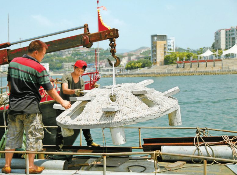 人工珊瑚架要预先固定放水里,潜水员下水后把珊瑚种在上面。