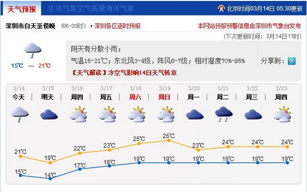 14日白天冷空气影响深圳,近日出现轻度的“回南天”现象将有所缓解。