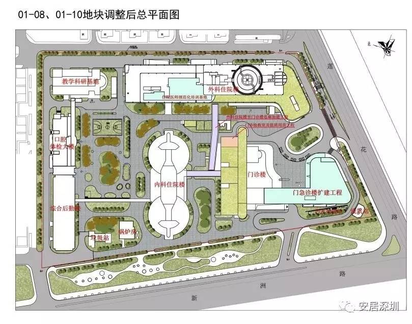 [莲花北、冬瓜岭地区]法定图则01-08、01-10地块位于福田区新洲路与莲花路交汇处东北角,01-08地块用地面积为45329.4平方米,规划用地性质为医疗卫生用地GIC4,容积率1.8, 配套设施为北京大学深圳医院。