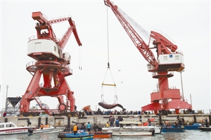 抹香鲸被吊出水面。 深圳特区报记者 刘羽洁 齐洁爽 摄