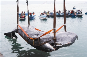 下午3时10分左右,惠州港码头巨大的吊臂伸向海中,开始吊装鲸鱼尸体。此时,潜水员潜入海中,将一张巨大的网伸到鲸鱼的腹下,再将网的四角捆系在吊车的吊缆上。4时20分左右,抹香鲸被吊离海面,装到一辆加长的平板拖车上,初定运往位于惠阳平潭的惠州市海洋与渔业科学技术研究中心,但其最终归宿还没有确定。有消息称,深圳博物馆正在积极与惠州方面沟通,希望永久保存这条抹香鲸。