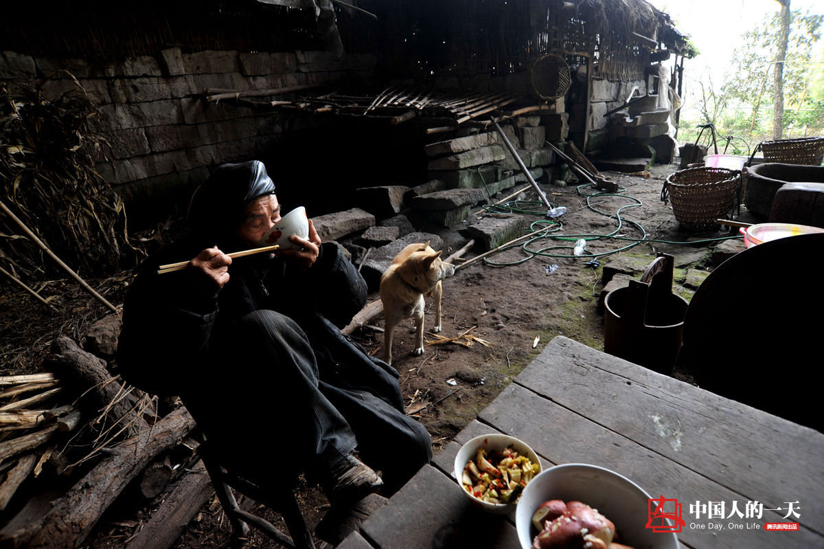 吃午饭时,5岁的大黄狗在他身后摆弄着尾巴绕来绕去,这顿饭,老人的主食是红薯,配上了一些腊肉和蔬菜。