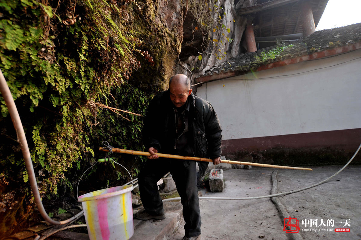 “硝洞”前方的石壁有一道石缝,常年有清澈泉水流出,这是梁自付平时的生活用水。不过近来泉水变小,无法取用,梁自付不得不去寺庙旁的水井挑水,再一晃一晃的挑回家。他说,现在年纪大了,体力不行了,喝水就成了他最难解决的头等大事。