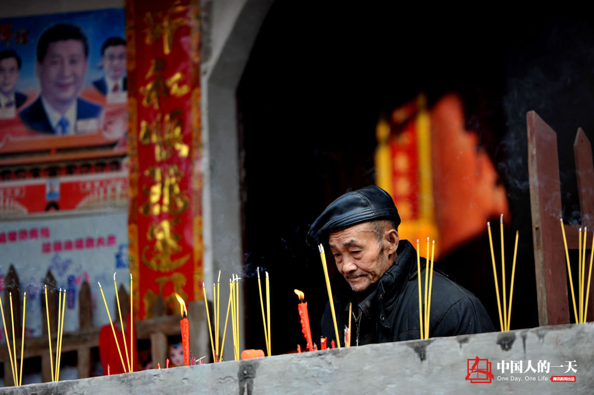 梁自付在寺庙里里点上香烛,为小孙子祈祷。他说:“我的小孙子是博士生,和我的感情最好,也最体贴我”。