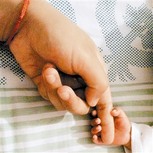 出生84天的天天抓住母亲申小俊的手指。 受访者供图