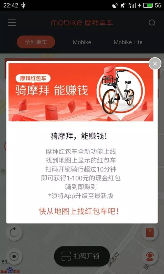 2、2小时内骑行免费,获得最低1元、最高100元的现金红包