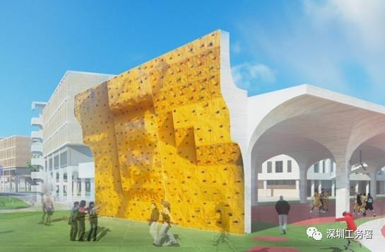 ▲在风雨连廊的北端端部设置攀岩墙,为校园休闲体育注入青舂活力。