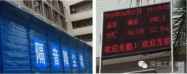 施工边界设置隔音降尘墙(顶端带喷淋设备)及实时分贝监测显示屏