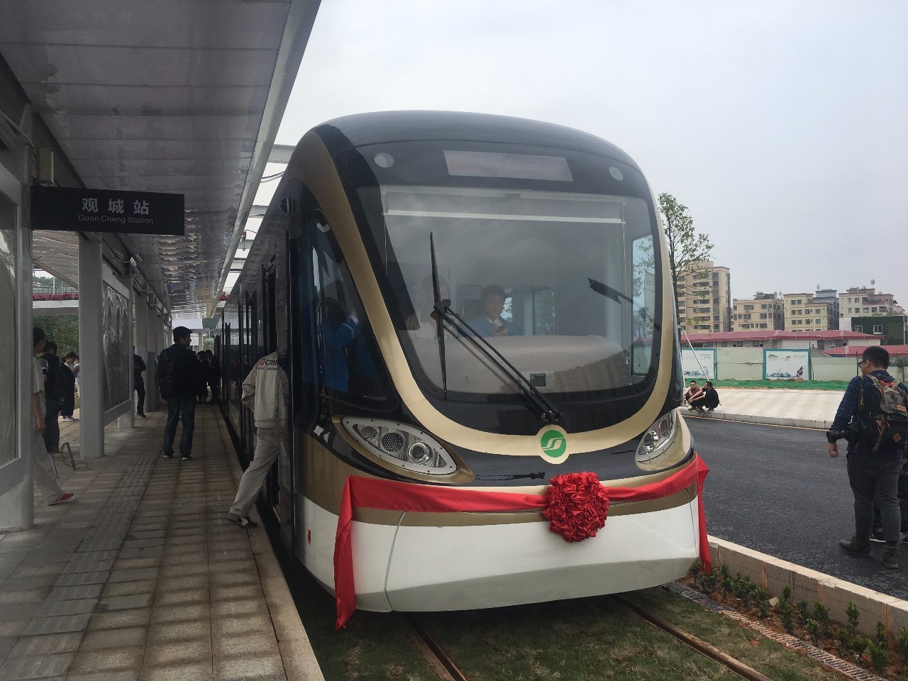 上午9时许,首列试跑电车从示范线主线的河西站站台前缓缓启动,以每小时15公里左右的低速,沿人民路由南向北行驶,大约2分钟后,到达下一站观城站,全程平顺,行驶噪音较小。