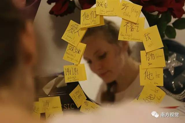她把中文词语和英语单词对应着写在便利贴上并贴在镜子前,以便随时复习。