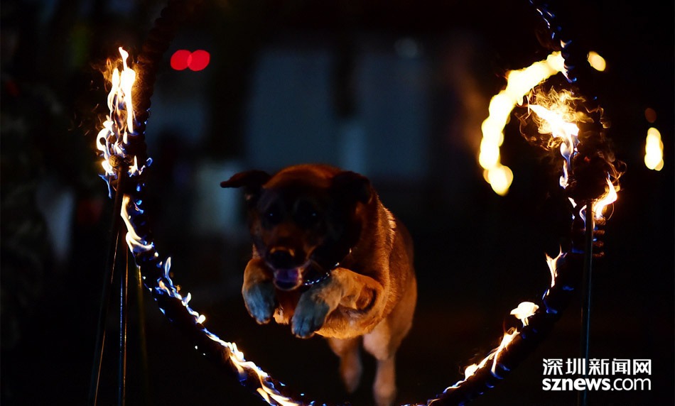 “怕什么,跳过去,你之前都跳得过去,不要怕!”蔡柏熹在起跑线上抚摸着相伴五年的“亲密战友”。一分钟后,他俩一起冲了出去,但是,意外的事发生了!就在“道海”即将穿越重重火障到达对面时,一只后腿卡在了最后一个火圈上,全身随即卡在火里; 只见蔡柏熹没有半点迟疑,双手伸进火里,一把扯出爱犬,弹出三米外。“道海”一顿‘汪汪’乱泣躲在蔡柏熹怀里。图为警犬穿越多重火圈训练。