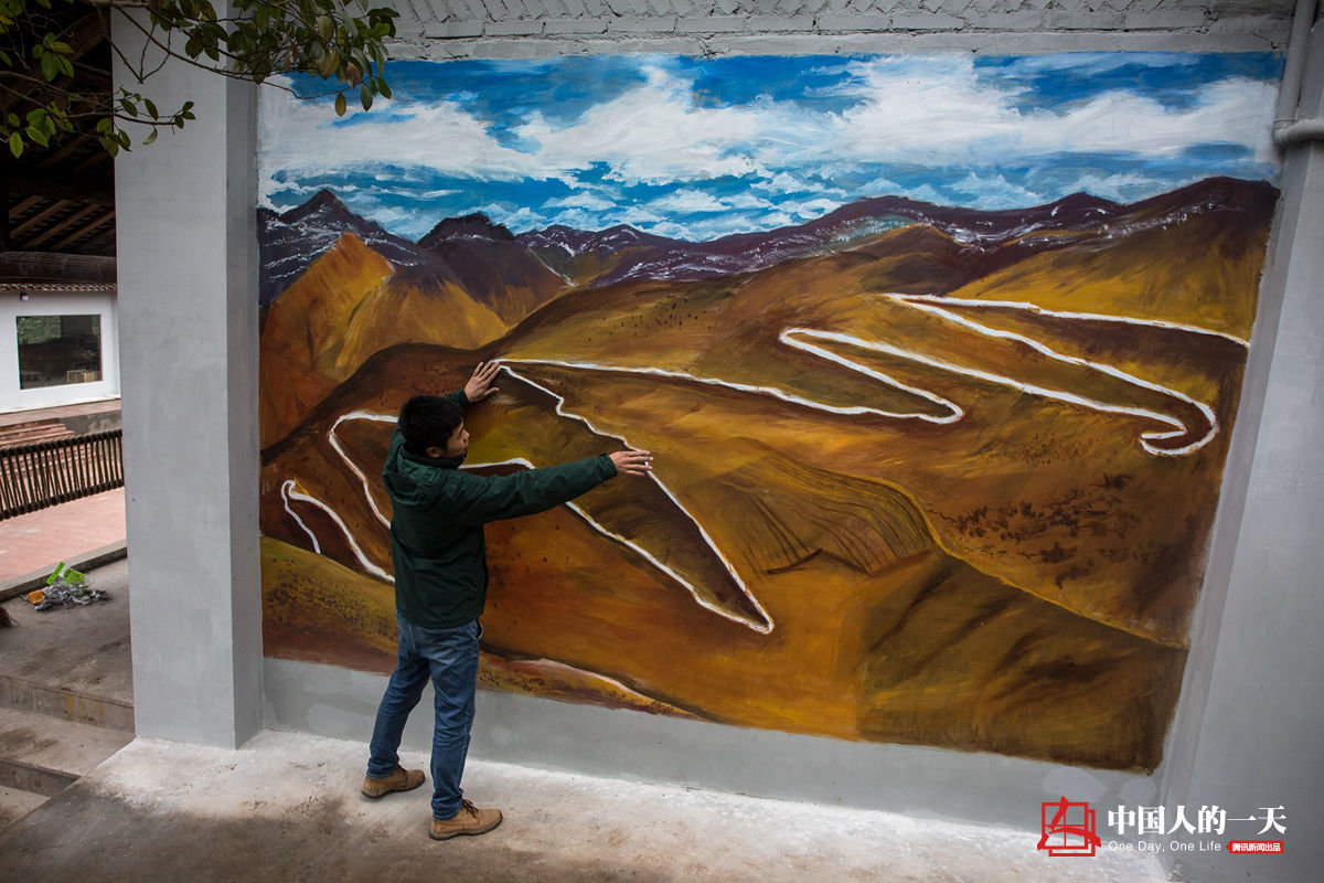 在离拉萨不远的松多小镇,隔着海拔5013米的米拉雪山,欧洪明兴奋异常。当车轮驶过康昂多南路的尽头,布达拉宫就远远地矗立在左侧群山的夹缝间,赭红色的宫殿冠着鎏金的屋顶。在历经25天的骑行后,他们终于骑到了川藏线的终点。图为客栈里墙壁上绘出著名的“怒江72拐”。每当凝视这幅水彩画,欧洪明对于它的波澜壮阔总是流连忘返。