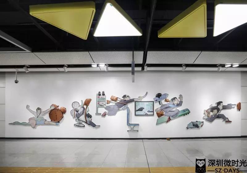 这幅名为”六点半,八点半”作品,立体造型突出墙面,让人看了不禁莞尔一笑:这不就是我们上班狗的日常写照嘛!不到六点就被闹钟吵醒,还没来得及撒撒起床气,就已经飞奔在通勤路上,又是地铁公交,又是滑板自行车的,上班之路堪比西天取经,需历经数难,还不能确保每天都能准时出现在公司打卡机前。