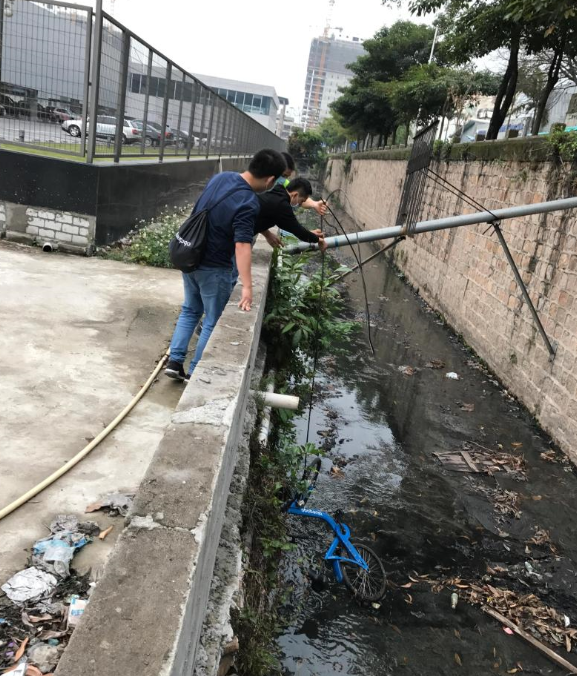不仅要在城中村这类复杂的环境中“打猎”,更有共享单车需要从水里捞上来。近两个月,小蓝侠已组织了四次水中捞车的行动。3月8日下午,01130等5位小蓝侠在蛇口松湖路附近的水沟中捞上来了几台小黄车和三台小蓝单车,当时那条水沟深5米,小蓝侠在现场缺乏工具,打捞车辆困难重重。