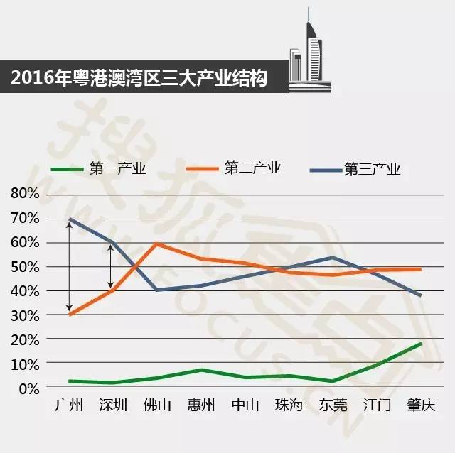 其中,从2016年粤港澳湾区的三大结构中可见,广州和深圳服务业占比最高。