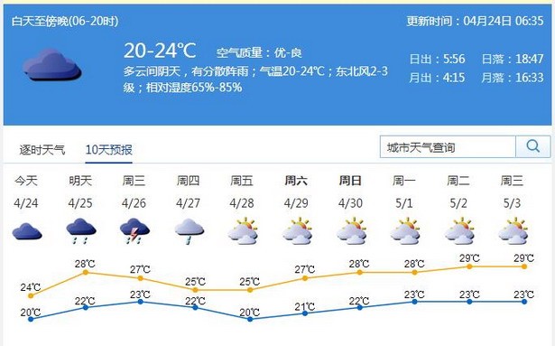深圳新闻网讯 深圳市气象台预计,24-25日我市有阵雨或雷雨,早晚有轻雾,气温逐步回升,24日气温21-26℃,25日可能出现南风加大过程带来的阵雨或雷雨,降雨突发性强、落区不确定性大,请关注市气象台发布的最新预报和预警信息。26-27日有一次雷雨天气过程,27日白天降雨减弱,气温略降2-3℃。28-30日多云,可见阳光,气温回升。目前预计五一假期(4月29日至5月1日)我市天气不错,没有明显降雨过程。