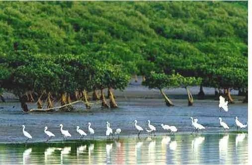 这里自然生长植物有海漆、木榄、秋茄等珍稀树种。也是国家级的鸟类保护区,每年有白琵鹭、黑嘴鸥、小青脚鹬等 189种,上10万只候鸟南迁于此歇脚或过冬。