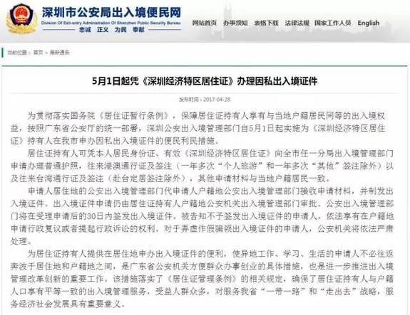 5月1日起,居住证持有人可凭本人居民身份证、有效《深圳经济特区居住证》向全市任一分局出入境管理部门申请办理 普通护照、往来港澳通行证及签注