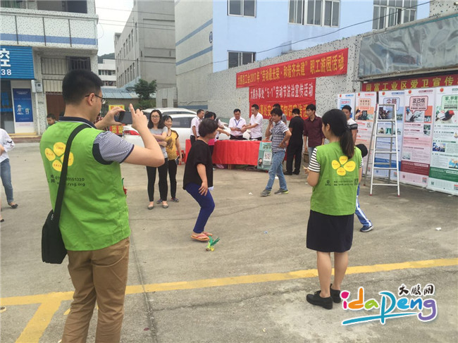 社工在现场设立一个劳动者维权法律法规宣传,派发法律宣传资料,为职工提供一个学习法律的知识平台。接下来便是每位职工期待已久的游园活动,分别有夹乒乓球、跳绳、踢毽子、呼啦圈、投掷羽毛球、击锣等游戏。在这里不仅能品味出政府对职工的关爱之心,也能享受到各种游戏项目带来的欢乐和刺激。每位在场职工纷纷积极参与,用欢笑表达了对这场活动的肯定。