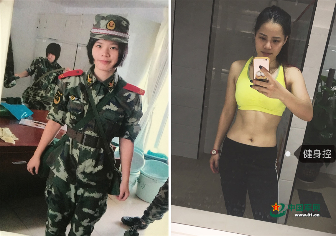 “90后”广州姑娘李晓玲当兵时和退伍后(拼版图片)。
