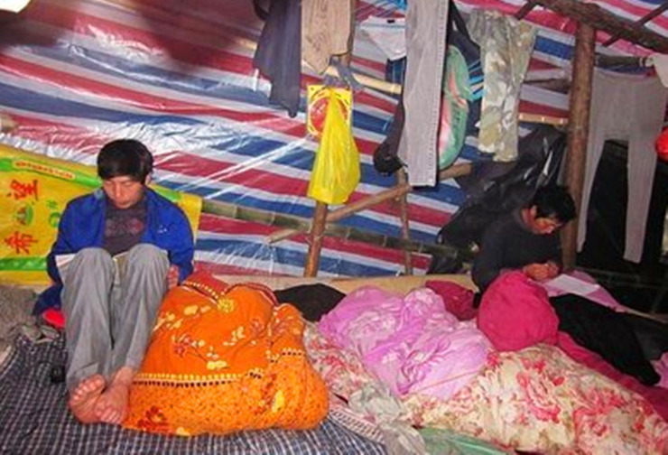 图为劳累了一天的工人们准备睡觉,睡觉也是在临时搭建的棚内。