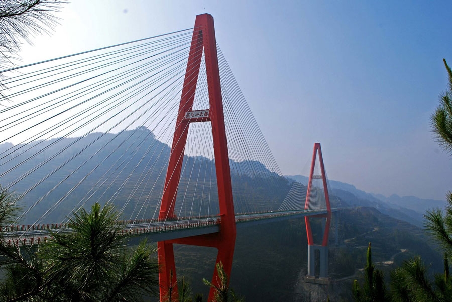 重庆是山水之城,全国跨长江大桥共有85座,其中有36座在重庆,超过三分之一。图为武陵山大桥。桥梁全长832米,桥宽24.5米,双向四车道,设计。桥面距谷底263米,其高度在全世界已建成的桥梁中居首位。
