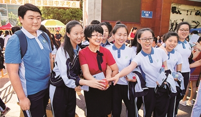 昨日上午7时许,已有高考考生陆续抵达福田中学考场,大家跟老师握手并互相鼓励。深圳特区报记者 刘羽洁摄