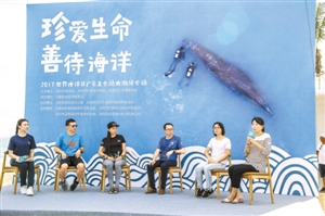 本报因积极参与救援抹香鲸而受到大鹏新区表彰。图为本报记者(右一)在论坛上介绍救援经过。 深圳商报记者 李博 摄