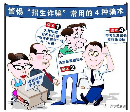 在招生录取诈骗中,最常见的就是不法分子打着招生机构“有内部关系”、“朋友”、“校友”等幌子,谎称可通过交钱换取“内部指标”、“点招指标”及“计划外指标”等,向考生和家长作“交钱就能低分高录”等虚假承诺。