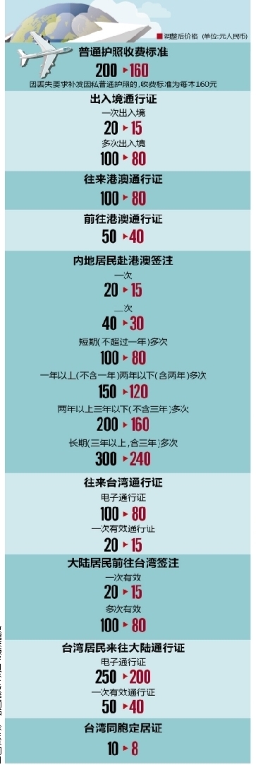 ② 今年7月1日起,普通护照收费标准将由目前的每本200元降为每本160元。港澳通行证收费标准将由每证100元降为每证80元。