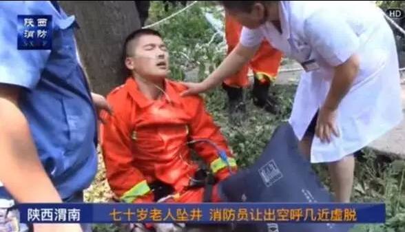 ⑥ 陕西渭南一70岁老人不慎掉入8米深井,由于缺氧严重,老人已近乎昏厥。两名消防员把呼吸器让给老人,分两次下井将其救出,自己却累得几近虚脱。
