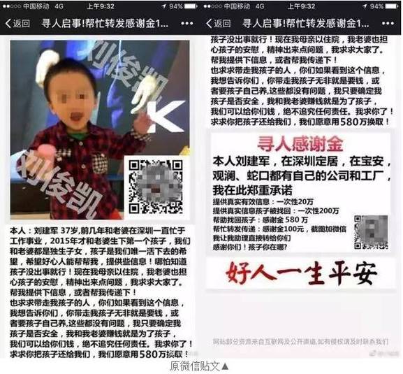 ③ 6月27日,一则“小孩走失已报警,如有网民找回将重金酬谢580万元”的信息在网上被疯转。由于儿童失踪地点为深圳世界之窗,南山公安分局立即组织辖区派出所民警核实,其后发现并无此人口失踪案件。 于是通过官微公布该则寻人启事为不实信息,并于昨日下午在珠海抓获造谣团伙。