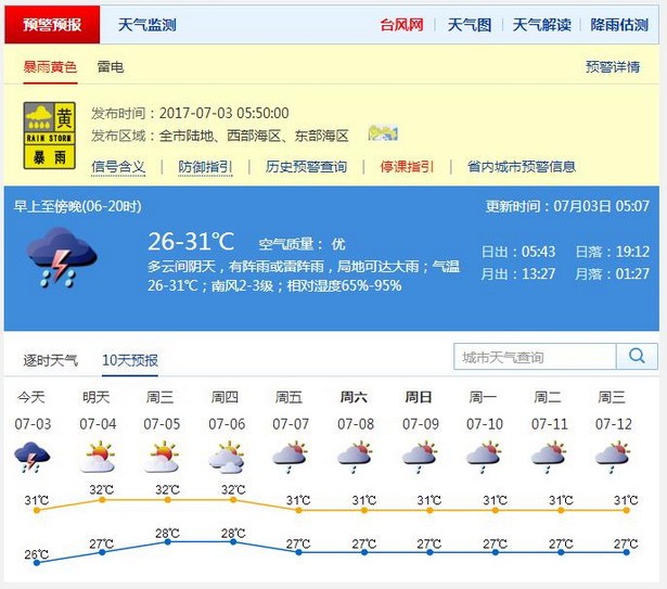市气象局于2日17时40分在深圳西部、福田区、南山区、光明新区、龙华区、坂田、新桥、燕罗、福海、航城发布雷电黄色预警。预计3日多云,有阵雨或雷阵雨,局部可达大雨量级,气温26-31℃,南风2-3级,空气相对湿度65%-95%。