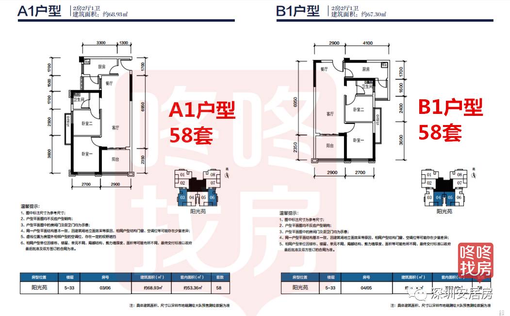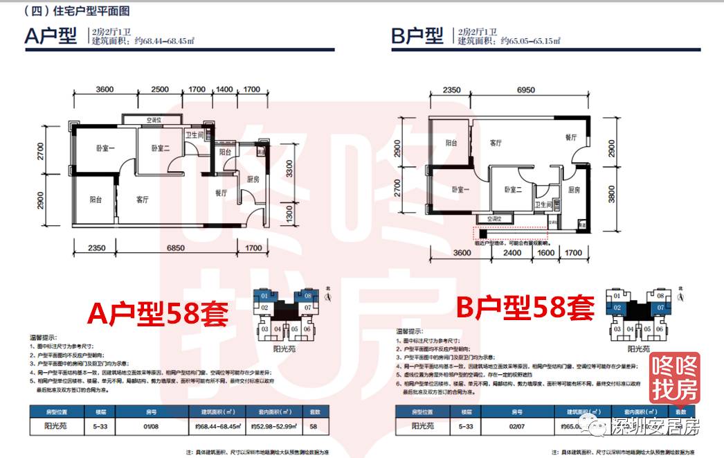 A户型为68平米,B户型为65平米,A1户型为68平米,B1户型为67平米,均为两房两厅一卫,每种户型各60套。