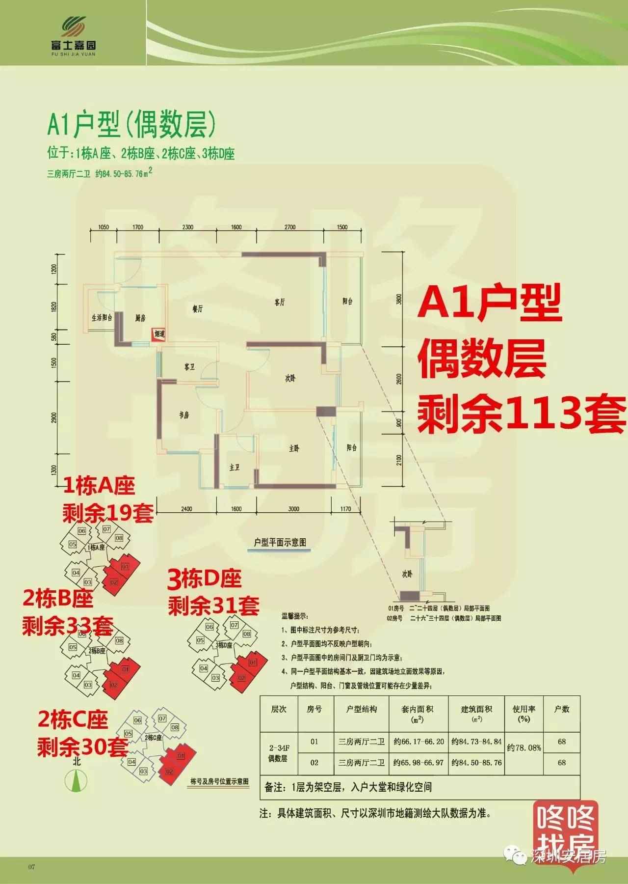 A1户型(偶数层)为三房两厅两卫,84-85平米,共剩余113套。其中,1栋A座剩余19套,2栋B座剩余33套,2栋C座剩余30套,3栋D座剩余31套。