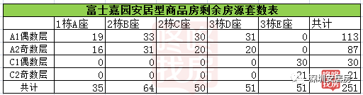 项目共5栋房源,剩余共251套。其中,1栋A座剩余35套,2栋B座剩余64套,2栋C座剩余50套,3栋D座剩余51套,3栋E座剩余51套。
