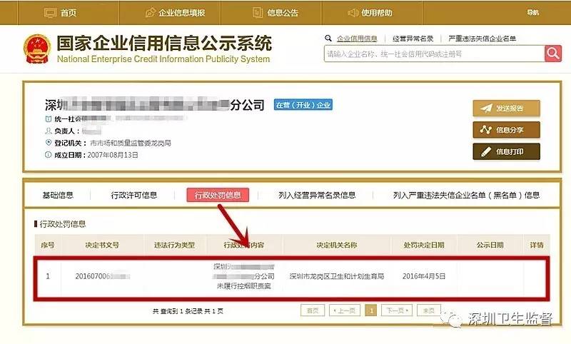 去年4月,卫监执法人员发现龙岗区某写字楼的吸烟现象严重,群众向物业管理公司投诉也未见其进行劝阻,现场调查也发现存在多个问题:因去年控烟的行政处罚政府公示后,该物业管理公司的行政处罚信息被“国家企业信用信息公示系统”采集,列入“黑名单”。