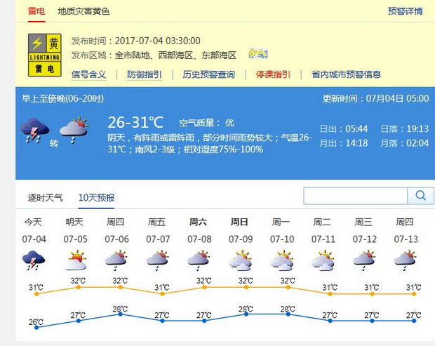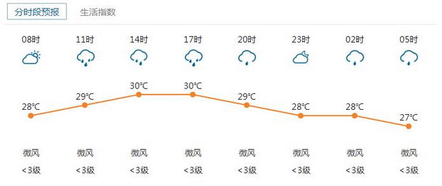 据市气象局预测,4日白天降雨减弱,转多云天气,气温26-31℃,南风2-3级,空气相对湿度75%-100%;5日以后副高加强控制,我市以多云天气为主,部分时间有阵雨或雷阵雨。5-7日多云,有阵雨,局部雨势较大。8-9日多云为主,偶有阵雨。今年第3号台风“南玛都”(强热带风暴级)未来将趋向日本,对我市没有影响,市气象台将不再发布相关信息。