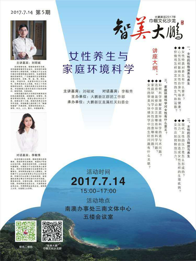 由大鹏新区群团工作部主办的“女性养生与家庭环境科学”讲座活动将于7月14日下午3点在南澳办事处三南文体中心举办。