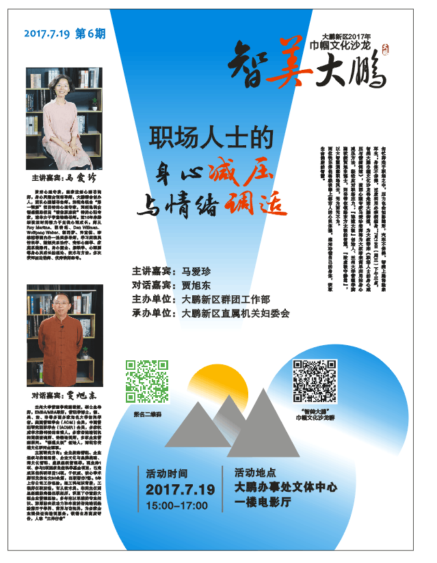 由大鹏新区群团工作部主办的“身心减压与情绪调适”讲座活动将于7月19日下午3点在大鹏办事处文体中心。